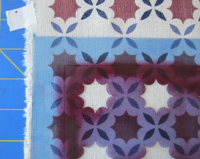 Before you start printing your repeating design, you should map out this repeat on your fabric. You could mark each dot with a fabric pen, the kind with the disappearing ink. If you choose this method, it is important that you test the ink on your fabric first because I find that the ink does not disappear on all fabrics. It should disappear with only a drop or two of water because you will not be able to wash the whole piece or your carefully printed paint will wash out. And it you iron it first to set the paint, you will also set your ink! From the photo above, it is obvious what I would recommend. Place a small piece of tape (I used white tape but any sort of tape will do) under the dot and then mark the dot, on the tape, with a regular pen or pencil. This has two advantages. First, you won't have to worry about the mark becoming permanent on your fabric. Second, the tape protects the fabric from the paint as you roll it out over your stencil design. You may like to reference this tutorial for some basics on paint and how to apply it!